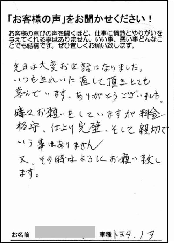 お客様からの感想 その5 【トヨタ ノア板金塗装修理 岩舟町在住 男性】
